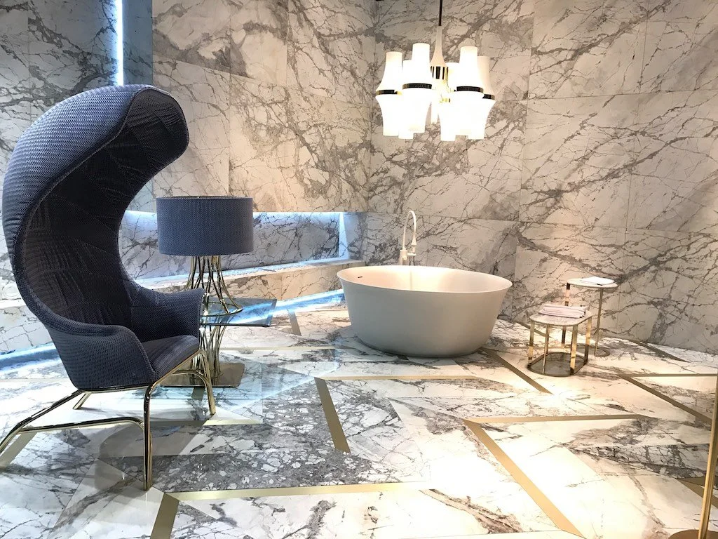 Tiles and Mosaics Marble tiles are everywhere, and we loved how many manufacturers and designers were mixing other materials with these tiles. We are seeing a return to elegance, and there was a touch of Art Deco in many of the designs. It’s amazing to see all of the different patterns that had intricate patterns and were cut using a water jet machine. Texture was also an important story in the various mosaics and we think that’s something we’ll be seeing more of.