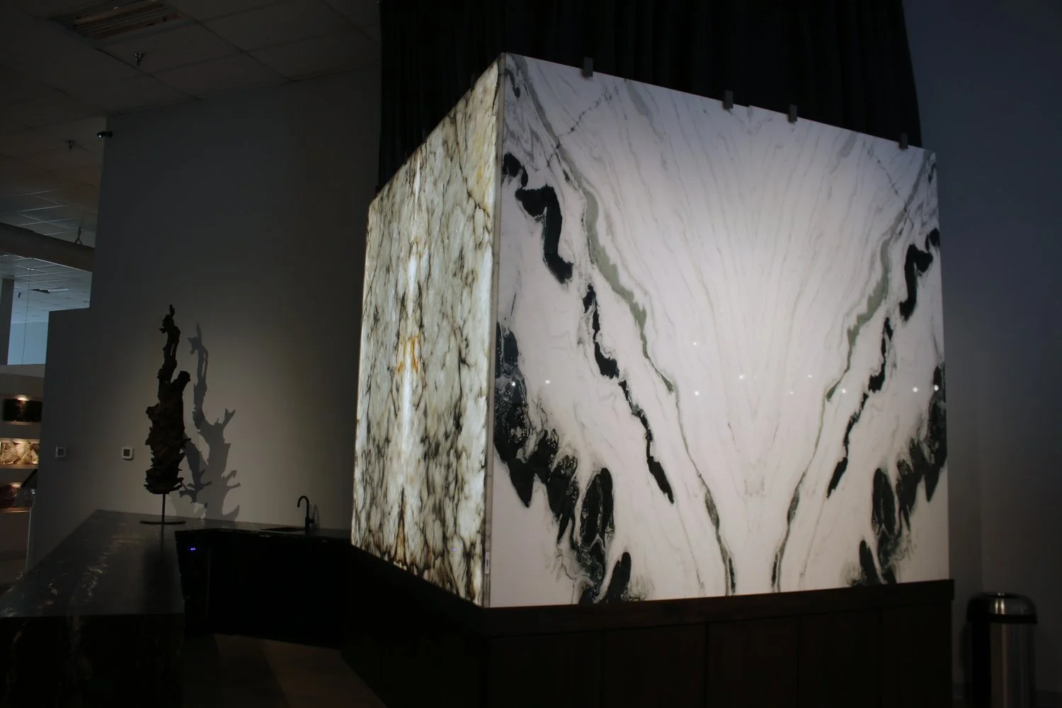 A spectacular display of book matched Ice Pearl Quartzite and Bianco Lasa Macchia Vecchia at Allied Stone Photo: Lisa Stewart Photography