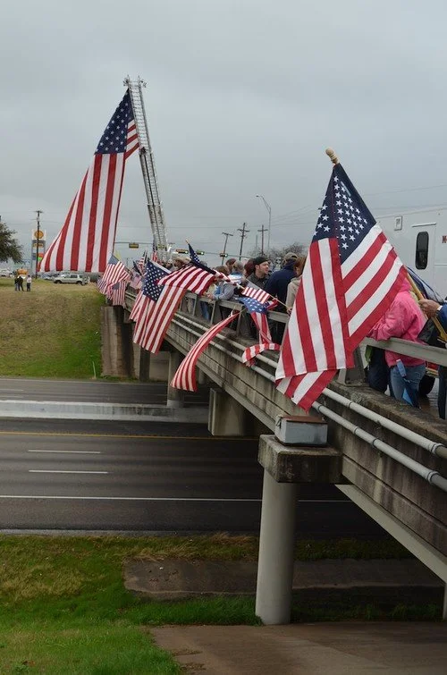 April 26, 2011. A day I won't forget, but it hadn't started that way. I was driving home from installing 3 new model homes in San Antonio, and as I drove north on interstate 35 I kept passing service men standing on the side of the road. As I got closer to Temple I saw people and flags lining the overpasses as well, so I pulled over to find out what was going on.